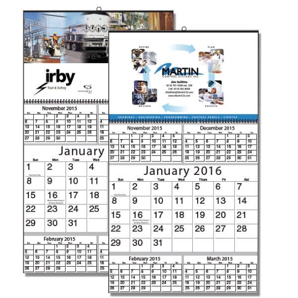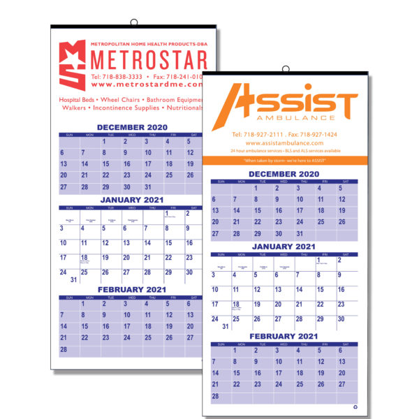 Wall Calendars are a great way of getting messages across, visible to everyone at all times. These Calendars are available in skirt style with backing and up to 4 color process. This is a 12 Month, 2 Color Wall Calendar, available Ruled or Unruled. Size is 9" x 19". Sundays and Holidays in blue, Tinned on Top. 3 Months at a glance. Imprint area is 8" x 4-1/2" on top. Price includes One Color Imprint. [table id=9 /]