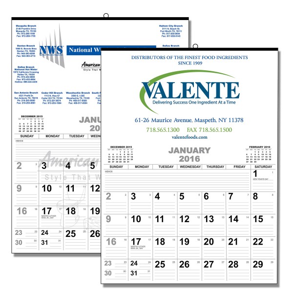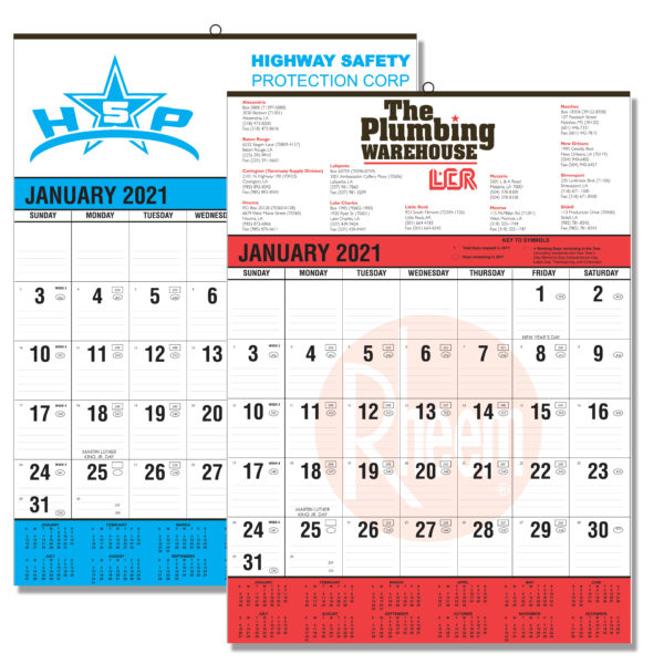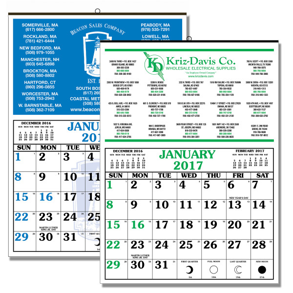 Wall Calendars are a great way of getting messages across, visible to everyone at all times. These Calendars are printed with your message each month up to 4 color process. This is a 12 Month 19" x 25", 2 Color Wall Calendar, available Ruled or Unruled. Sundays and Holidays are Hi-lighted, Tinned or Spiral bound on Top. Imprint area is 18" x 8". [table id=10 /]