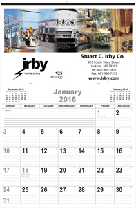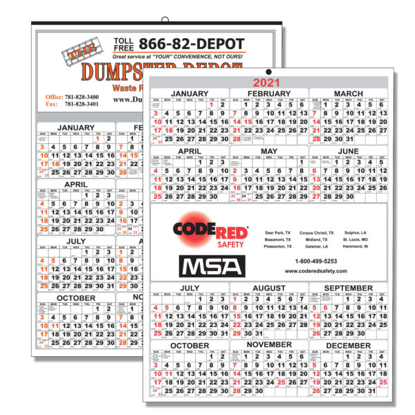 Contractor calendars use is utilized in many industries. It is a 12 Month 18" x 24" 2 Color Wall Calendar, Tinned on on Top. Calendars include julian dates and working days, Faint lines in each date box for notes. Grid includes highlighted top and bottom which can done in standard/special colors. Imprint area is 17" x 5.5". Price includes One Color Imprint. [table id=1 /]