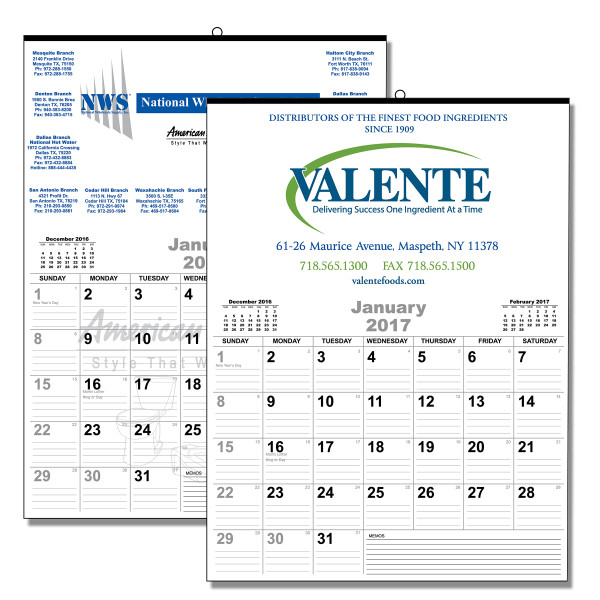 Wall Calendars are a great way of getting your ad visible 365 days a year. These Calendars are available in skirt style with backing and up to 4 color process. This is a 12 Month 18″x24″, 2 Color Wall Calendar, available Ruled or Unruled. Sundays and Holidays are Hi-lighted option, Tinned or Spiral bound on Top. Imprint area is 18″ x 8″. Price includes One Color Imprint. [table id=2 /]